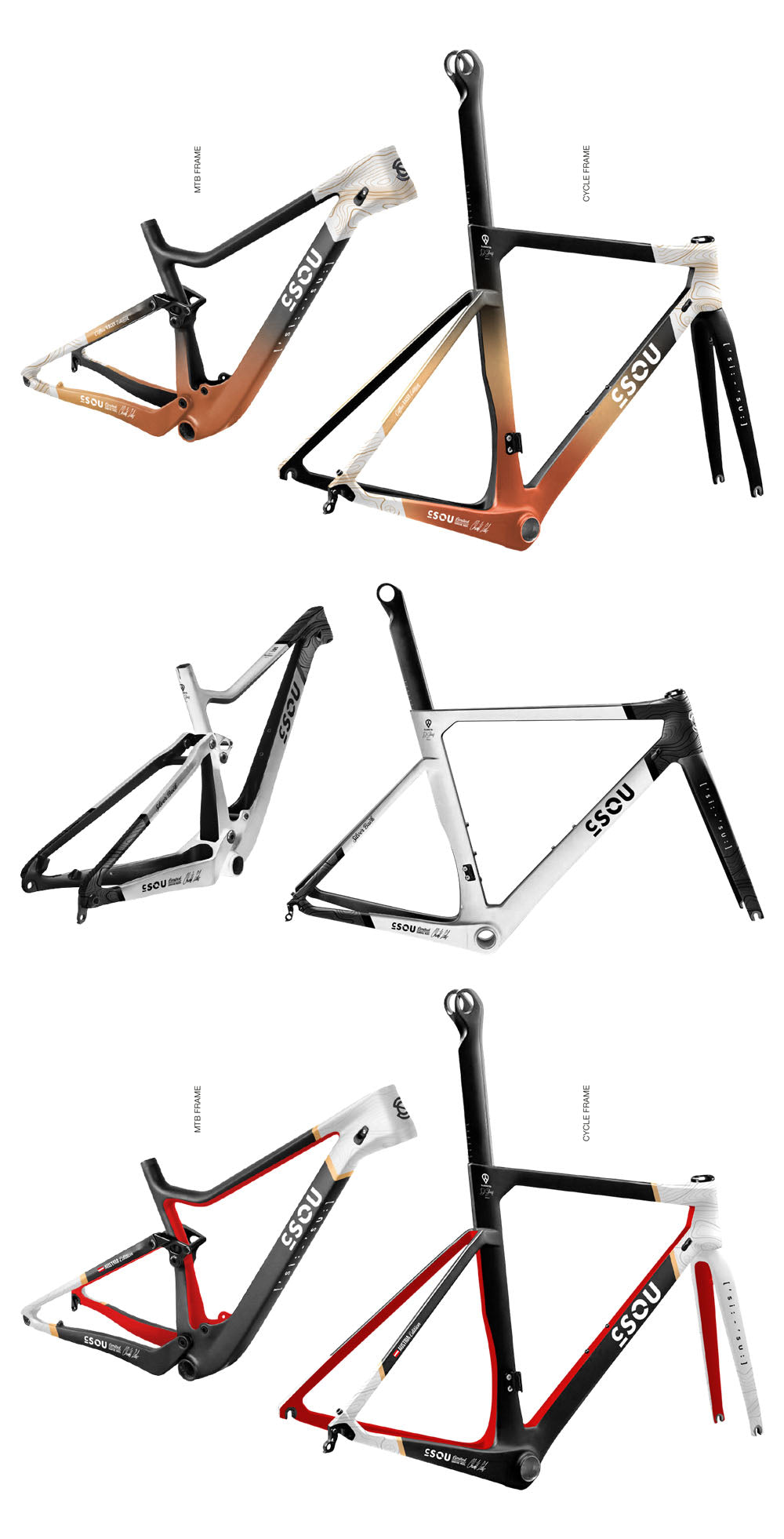 Hier ein kleiner Einblick in eine Auswahl von Farbkombinationen auf Rahmen und Komponenten. Die Karten-Höhenlinien, die Ausdauersportlern durch Strava bekannt sind, wurden als Texturelement eingesetzt, um beim Konsumenten Vertrautheit und Wiedererkennung zu schaffen.